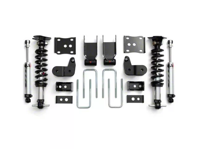 Adjustable Lowering. Made for the 4WD F-150, this QA1 Lowering Kit comes in a matte black and polished chrome finish. Built to give your ride an adjustable lowering of 3.50 to 5.50 inches, this heavy-duty lowering kit is made in the USA and includes polyurethane bushings, a Chromoly T-bar, a rear flip kit, shackle and hanger kits, and double adjustable shocks.