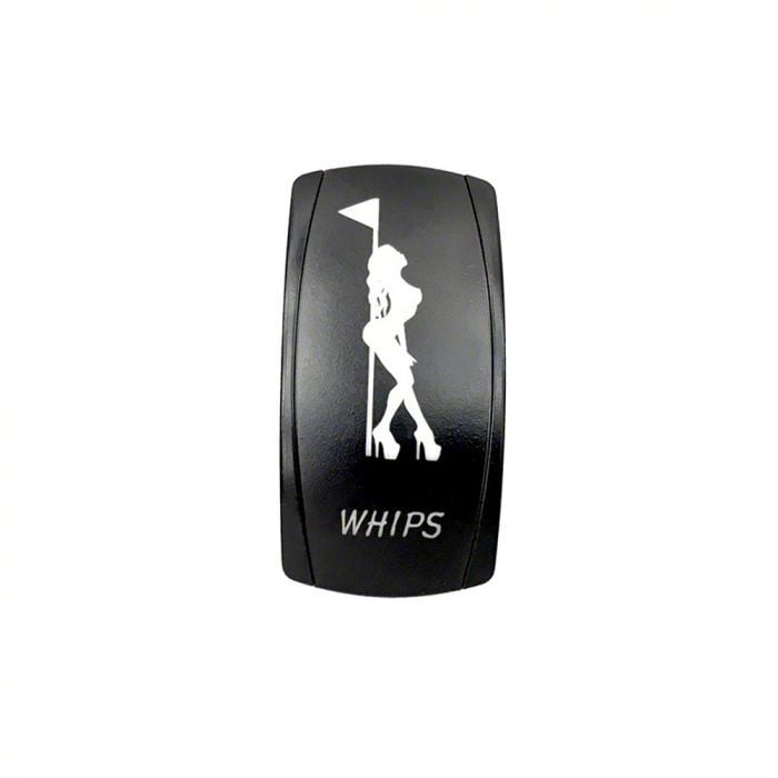 Durable Lighting Control. The Quake LED 2-Way Rocker Switch is a compact and high-performance accessory designed to provide easy control for off-road lighting and other auxiliary functions on 12-volt vehicle systems. Whether you're outfitting your rig for rugged terrain or enhancing night-time visibility, this switch delivers bright, reliable operation. It features a stylish matte white finish with a distinctive Whips logo and text design that illuminates in sync with your dashboard lights.