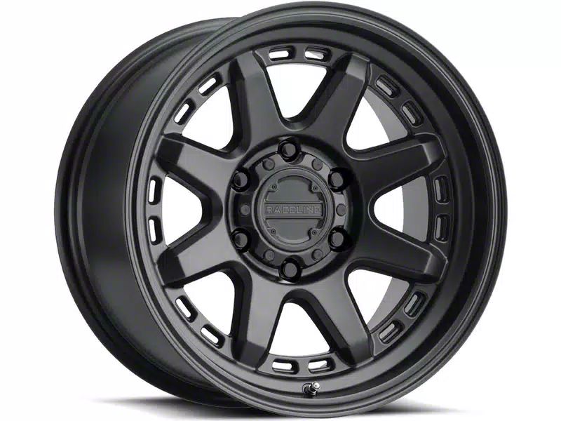 Raceline Scout Satin Black 6-Lug Wheel; 18x9; -12mm Offset. The Raceline Scout Satin Black 6-Lug Wheel offers a striking balance of style and refinement. Its unique design accentuates the vehicle's aesthetic, while the premium construction underscores its robust nature. This wheel is a perfect choice for those seeking both elegance and a strong visual statement.
