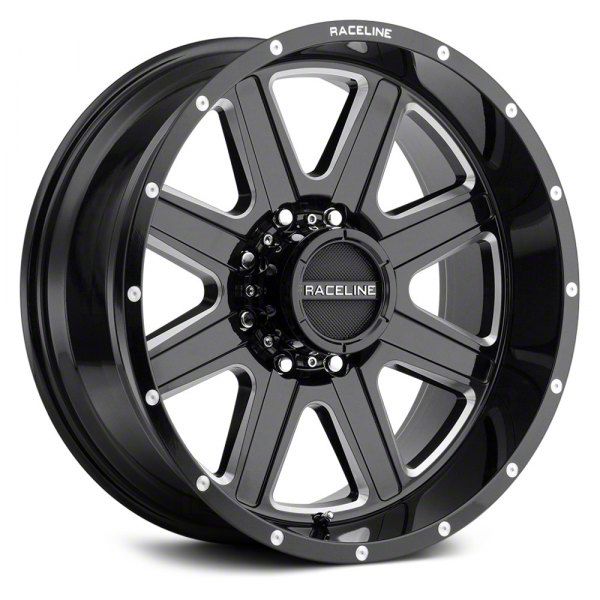 Raceline Hostage Gloss Black Milled 8-Lug Wheel; 20x10; -19mm Offset - This wheel's elegant design will certainly enhance your vehicle's aesthetic, complementing its luxury and performance. The unique styling of this wheel makes it an ideal choice for a standout quality of your ride, reflecting the premium quality associated with the Raceline brand.