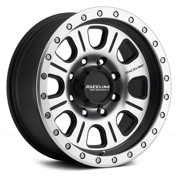 Raceline Monster Matte Black Machined 6-Lug Wheel; 17x9; -12mm Offset. The Raceline Monster Matte Black Machined 6-Lug Wheel offers a striking balance of style and refinement. Its unique design accentuates the vehicle's aesthetic, while the premium construction underscores its robust nature. This wheel is a perfect choice for those seeking both elegance and a strong visual statement.