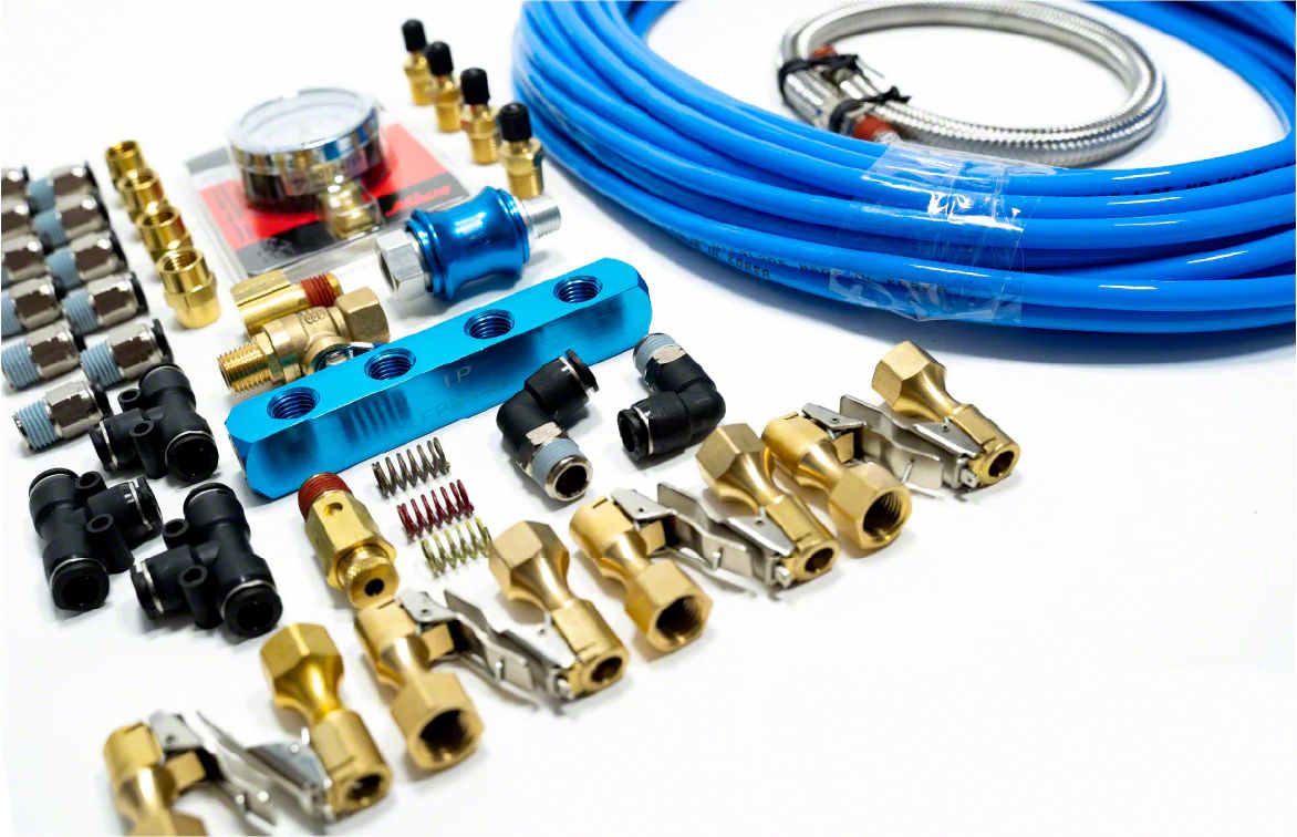 Construction and Appearance. This air system features 3/8-inch high-flow air lines and a braided stainless steel inlet line, ensuring durability and longevity. The solid brass fittings and chucks offer secure connections, while the billet aluminum distribution block provides a sturdy base. The included blue air hose is rated for up to 170 PSI, showcasing both quality and reliability.