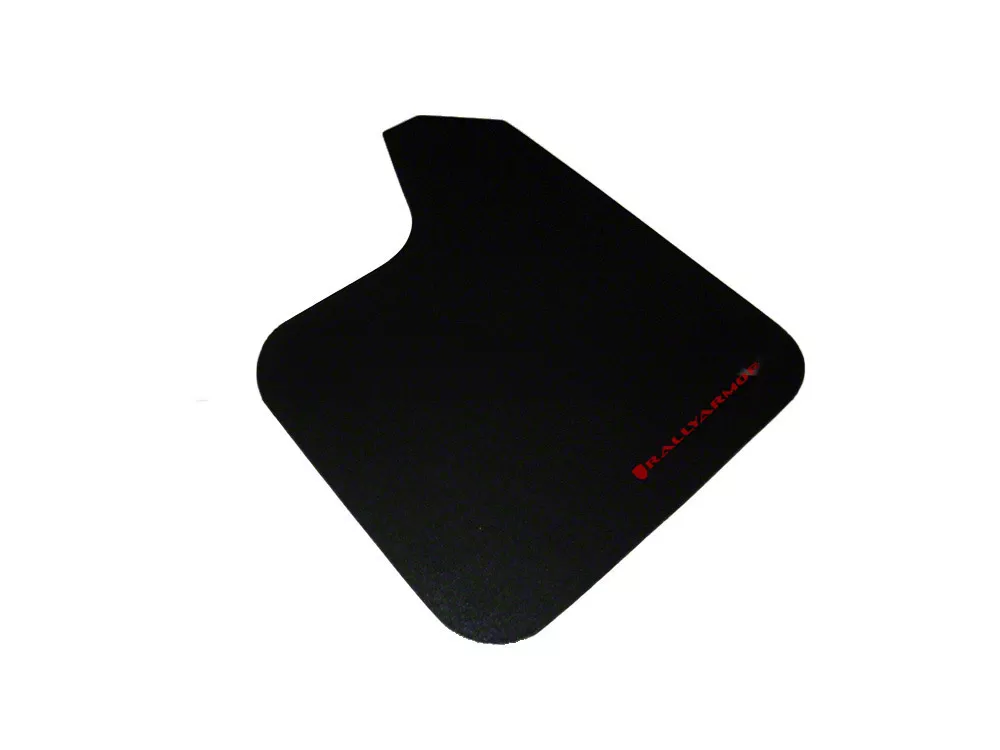 Practical Protection. The Mud Flaps are designed to protect your vehicle's body and paint from mud, rocks, and road debris. Made of UV-resistant black poly-blend plastic, these flaps are both durable and stylish, featuring a distinctive red Rally Armor logo on each flap.