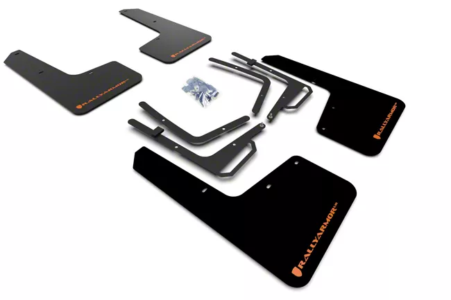 Durable Mud Flaps. These Mud Flaps are designed to provide superior protection for your vehicle against mud, rocks, and other road debris. The front and rear configuration ensures complete coverage, keeping your F-150 Raptor looking clean and well-maintained. The hazard orange finish with the Rally Armor logo design adds a striking visual element to your truck, enhancing its appearance while providing practical benefits.
