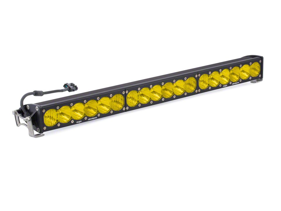 OnX6 Strong. The Baja Designs® 30 in. OnX6 Amber LED Light Bar - Driving/Combo Beam System works for near and far field applications with wide driving (44°) and spot (6°) optics using 18 LEDs in a single row formation. It is designed for the 1994-2026 Dodge RAM 1500.