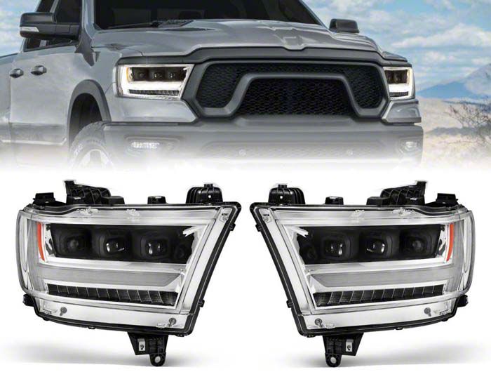 Projector Style Headlight. Looking for new lights for your RAM 1500? Then get ready to swap out you factory Halogen lights because this Full LED Projector Headlight; Chrome Housing; Clear Lens; Driver and Passenger Side is for you. Elevate your auto's appearance and cruise through the night with this bright LED Headlamps .