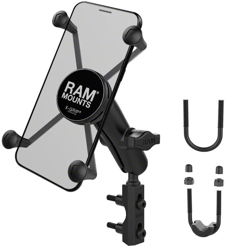 Description. The RAM-B-174-UN10 consists of hardware for mounting to either brake/clutch reservoirs and rails that are 0.5" to 1.25" in diameter, double socket arm and universal X-Grip large phone/phablet holder. Designed into the mount is a 1" diameter patented rubber ball and socket system with adjustment points at both ends of the socket arm; this with a twist of the arm knob, allows you to move the X-Grip mount to your optimum viewing position. The mounting hardware for brake/clutch reservoirs include both standard and metric mounting bolts. The included X-Grip cradle has a clean and clever four leg design that sports great holding power without hiding your phone behind foam pads and plastic. The spring loaded X-Grip cradle expands and contracts, allowing for a perfect custom fit of your cell phone. The perfect complement to the modern sleek interior of today's vehicles, the RAM X-Grip is the cell phone cradle evolved. The X-Grip includes a device tether recommended for outdoor applications. The cradle is compatible with handheld devices that will fit the dimensions listed below. It is important to verify the dimensions of your handheld device with a case/sleeve/skin when determining the overall size.