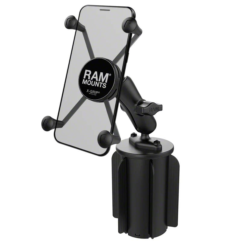 Secure and Versatile Mounting Solution. The Phone Mount with RAM-A-Can II Cup Holder Base offers a reliable and adjustable mounting system for large phones and phablets. Its spring-loaded X-Grip® cradle ensures a secure hold without obscuring your device, while the flexible support fins of the RAM-A-Can II base adapt to various cup holder sizes, providing a stable installation across different vehicles.