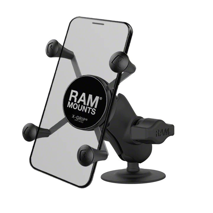 Description. The RAP-B-378-A-UN7U consists of the flex adhesive base with 1" ball, SHORT double socket arm and universal X-Grip cradle. Using a PSA stick pad, put the flex adhesive mount practically anywhere you want to keep your portable electronics easy to see and always within your reach. Designed with a very small foot print, finding a home on your scooter, motorcycle, kayak, boat or vehicle dash is easy. The mount is designed with a RAM 1" diameter patented rubber ball and socket system that has adjustment points at both ends of the double socket arm; this allowing for almost infinite adjustment and perfect viewing angles. The included X-Grip cradle has a clean and clever four leg design that sports great holding power without hiding your phone behind foam pads and plastic. The spring loaded X-Grip cradle expands and contracts, allowing for a perfect custom fit of your cell phone.