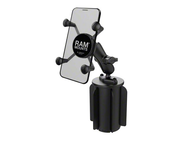 Description. The RAP-299-3-UN7BU consists of the RAM-A-CAN™ cup holder base, double socket arm and universal X-Grip cradle. The cup holder base includes a 6" flex mounting feature. A durable composite shell construction and soft fins that can be trimmed to fit makes the cup holder mount one of the most portable and versatile “Go Anywhere” products offered. The mount is designed with a RAM 1" diameter patented rubber ball and socket system that has adjustment points at both ends of the double socket arm; this allowing for almost infinite adjustment and perfect viewing angles. The included X-Grip cradle has a clean and clever four leg design that sports great holding power without hiding your phone behind foam pads and plastic. The spring loaded X-Grip cradle expands and contracts, allowing for a perfect custom fit of your cell phone. The perfect complement to the modern sleek interior of today's vehicles, the RAM X-Grip is the cell phone cradle evolved. The X-Grip includes a device tether recommended for outdoor applications. The cradle is compatible with handheld devices that will fit the dimensions listed below. It is important to verify the dimensions of your handheld device with a case/sleeve/skin when determining the overall size.