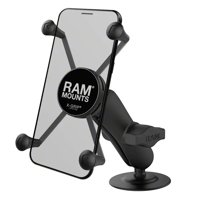 Description. The RAP-B-378-UN10U consists of the flex adhesive base with 1" ball, double socket arm and universal X-Grip cradle. Using a PSA stick pad, put the flex adhesive mount practically anywhere you want to keep your portable electronics easy to see and always within your reach. Designed with a very small foot print, finding a home on your scooter, motorcycle, kayak, boat or vehicle dash is easy. The mount is designed with a RAM 1" diameter patented rubber ball and socket system that has adjustment points at both ends of the double socket arm; this allowing for almost infinite adjustment and perfect viewing angles. The included X-Grip cradle has a clean and clever four leg design that sports great holding power without hiding your phone behind foam pads and plastic. The spring loaded X-Grip cradle expands and contracts, allowing for a perfect custom fit of your cell phone. The X-Grip includes a device tether recommended for outdoor applications. The cradle is compatible with handheld devices that will fit the dimensions listed below. It is important to verify the dimensions of your handheld device with a case/sleeve/skin when determining the overall size.