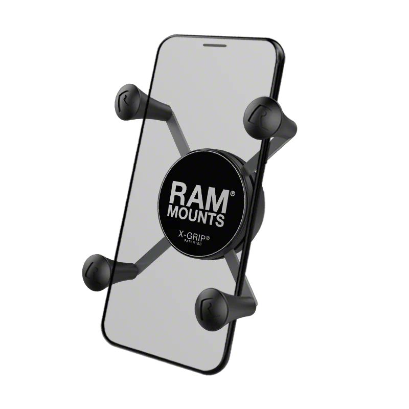 Description. If you are looking for a compact mount for your cell phone without that cookie cutter shape, you've found it. The RAM X-Grip has a clean and clever four leg design that sports great holding power without hiding your phone behind foam pads and plastic. The perfect complement to the modern sleek interior of today's vehicles, the RAM X-Grip is the cell phone cradle evolved. Compatible and interchangeable with a wide range of popular RAM Mounting products, this elegant cradle is ready to compliment your phone and become the most useful accessory in your vehicle. The X-Grip includes a device tether recommended for outdoor applications. The cradle is compatible with handheld devices that will fit the dimensions listed below. It is important to verify the dimensions of your handheld device with a case/sleeve/skin when determining the overall size.