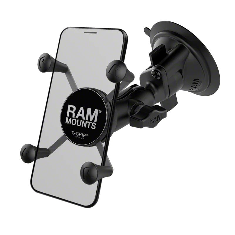 Description. The RAM-B-166-A-UN7U consists of a 3.3" diameter suction cup twist lock base, SHORT length double socket arm and universal spring loaded X-Grip cradle for cell phones. The suction cup, twist lock base is designed to have a strong hold on glass and non-porous plastic surfaces. The included X-Grip cradle has a clean and clever four leg design that sports great holding power without hiding your phone behind foam pads and plastic. The spring loaded X-Grip cradle expands and contracts, allowing for a perfect custom fit of your cell phone. The perfect complement to the modern sleek interior of today's vehicles, the RAM X-Grip is the cell phone cradle evolved.