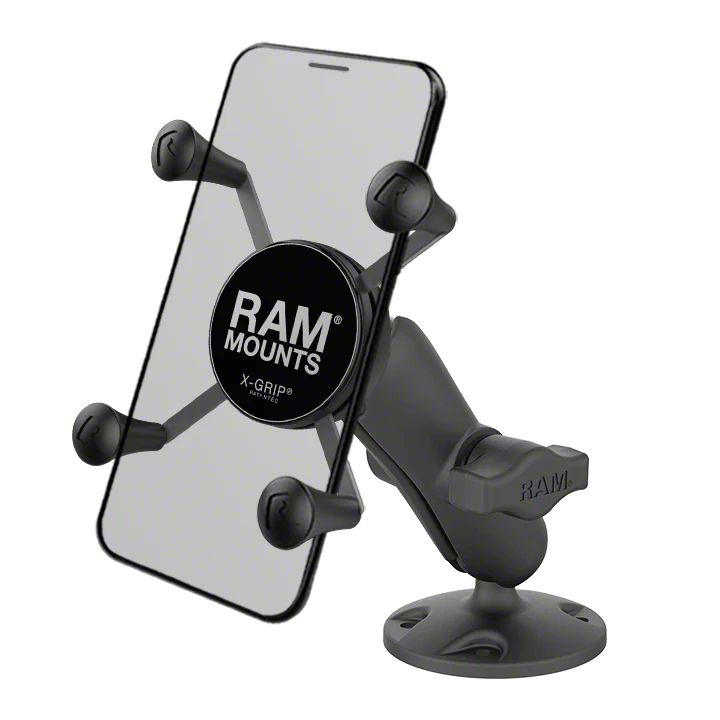 Rugged and Adjustable Mount. The RAM Mounts X-Grip High-Strength Composite Phone Mount with Drill-Down Base provides a rock-solid, customizable solution for securely holding your phone. Its spring-loaded X-Grip design expands to fit devices 1.87-Inch to 3.25-Inch wide—even when in a case—while maintaining full access and functionality. Ideal for both on- and off-road applications, this mount includes a 2.5-inch round base with AMPS hole pattern for permanent installation and offers a wide range of angle adjustment using RAM’s ball-and-socket technology.