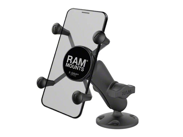 Description. The RAP-B-138-UN7U consists of a 2.5" diameter round base featuring the universal AMPS hole pattern, medium length composite double socket arm, and the popular spring-loaded RAM X-Grip phone holder. The RAM X-Grip features an 'X' design that expands and contracts to provide a perfect fit for your device – even if it's in a case. Made of marine-grade, stainless steel components and high-strength composite, this version of the RAM X-Grip fits phones ranging from 1.87" to 3.25" in width and keeps your device completely functional and accessible. RAM ball and socket technology allows for near-infinite adjustability to achieve the ideal viewing angle – while also extending the life of your phone by providing shock and vibration damping. For outdoor applications, the RAM X-Grip includes a device tether that is recommended for added security and peace of mind.