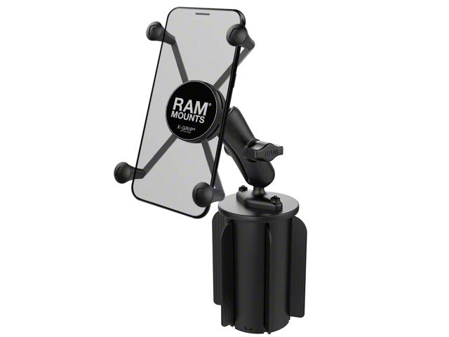 Description. The RAP-299-3-UN10U consists of the RAM-A-CAN™ cup holder base, double socket system and universal spring loaded X-Grip cradle for large phones and phablets. Included are support fins that flex, making the cup holder base conform to most vehicle cup holders. The mount is designed with a RAM B size 1" diameter patented rubber ball and socket system that has adjustment points at both ends of the double socket arm; this allowing for almost infinite adjustment and perfect viewing angles. The spring loaded X-Grip cradle expands and contracts, allowing for a perfect custom fit of your phone or phablet. The X-Grip includes a device tether recommended for outdoor applications. The cradle is compatible with handheld devices that will fit the dimensions listed below. It is important to verify the dimensions of your handheld device with a case/sleeve/skin when determining the overall size.