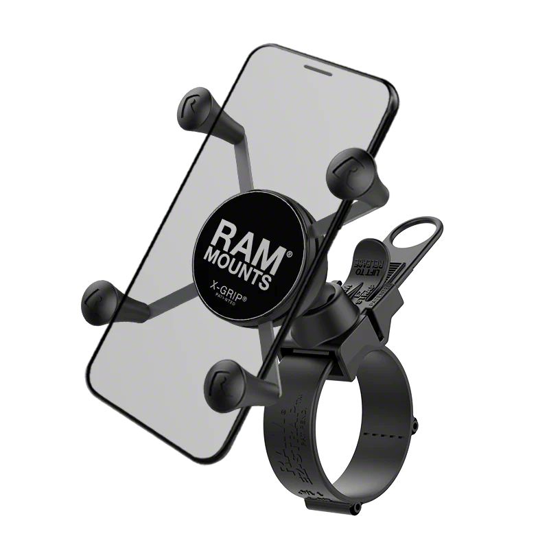 Secure X-Grip Cradle for a Wide Range of Smartphones. The spring-loaded RAM Mounts X-Grip Phone Mount expands and contracts to fit most smartphones with or without cases, securely holding devices ranging from 1.875 to 3.25 inches wide. Rubber-coated grips provide a snug fit without scratching your device, ensuring your phone stays firmly in place—even in rugged environments.