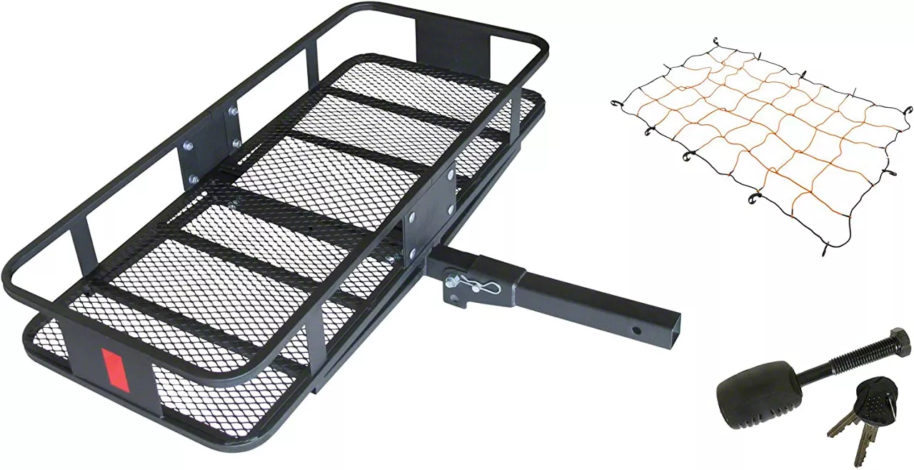 Heavy Handling. Maximize your vehicle's storage capabilities with the 2-Inch Receiver Hitch Deluxe Fold-Up Cargo Carrier Kit. Universally designed, this kit accommodates a variety of vehicles. Built to handle up to 500 pounds, this carrier offers ample space for your gear, whether for camping trips or moving items.