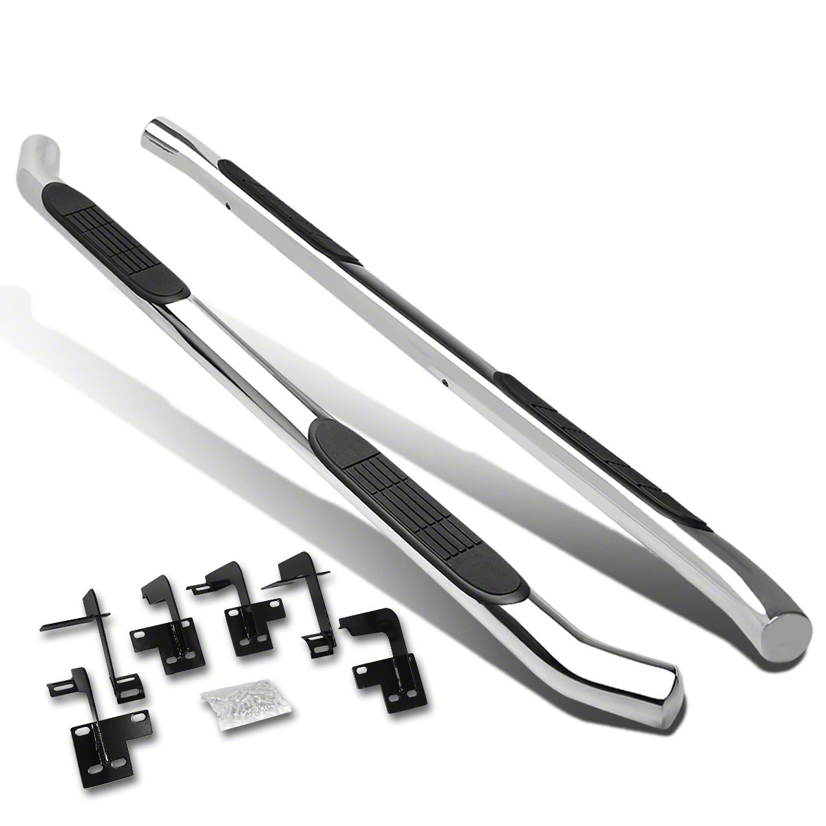 Durable Build with a Long-Lasting Shine. Made for tough jobs and harsh all-terrain conditions, these round stainless steel bars exhibit ultimate tensile strength and high structural rigidity. The 3-inch, anti-skid footpads made of heavy-duty polycarbonate provide secure footings on wet and dry conditions. In addition, each nerf bar is fortified with a bright, polished finish for extra protection from rust and scratches while adding a striking accent to your Quad Cab’s exterior.