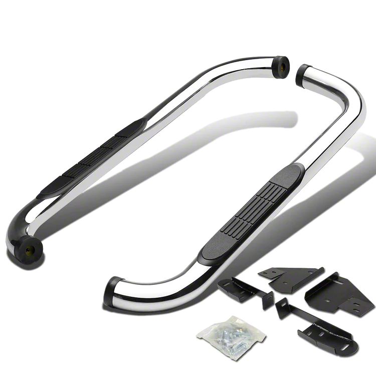 Construction and Appearance. Constructed from premium stainless steel tubing, these side step bars feature a polished chrome finish for a sleek, durable look that withstands harsh weather and road conditions. The 3-inch wide step area includes matte black ABS plastic step pads, offering a slip-resistant surface for secure footing. The round design with 90-degree curved ends and ABS end caps adds a refined, rugged look that complements your vehicle’s aesthetics.
