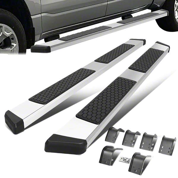 Sturdy and Stylish Accessibility. The running boards designed for 2009-2018 RAM 1500 Quad Cab models enhance vehicle accessibility while adding a sleek, polished chrome finish to the truck's exterior. These boards are crafted from durable stainless steel, ensuring they can support up to 500 pounds without bending or breaking. The five-inch width provides ample footing, and the honeycomb thread design on the step pads offers excellent traction, reducing the risk of slips and falls in wet or icy conditions.
