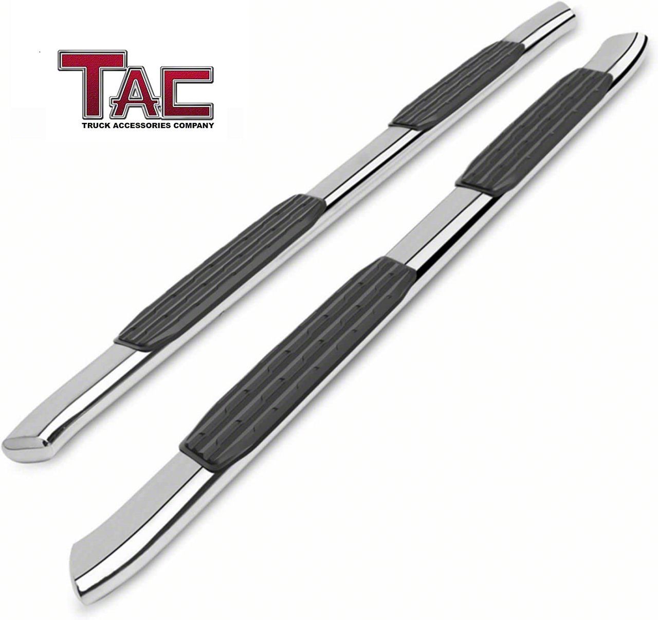 Construction and Appearance. Built from stainless steel, these step bars feature a polished chrome finish that resists corrosion and enhances exterior appeal. The matte black finish step pads provide non-slip grip, adding safety and durability to daily entry and exit. The oval tubing adds strength while maintaining a smooth, aerodynamic form.