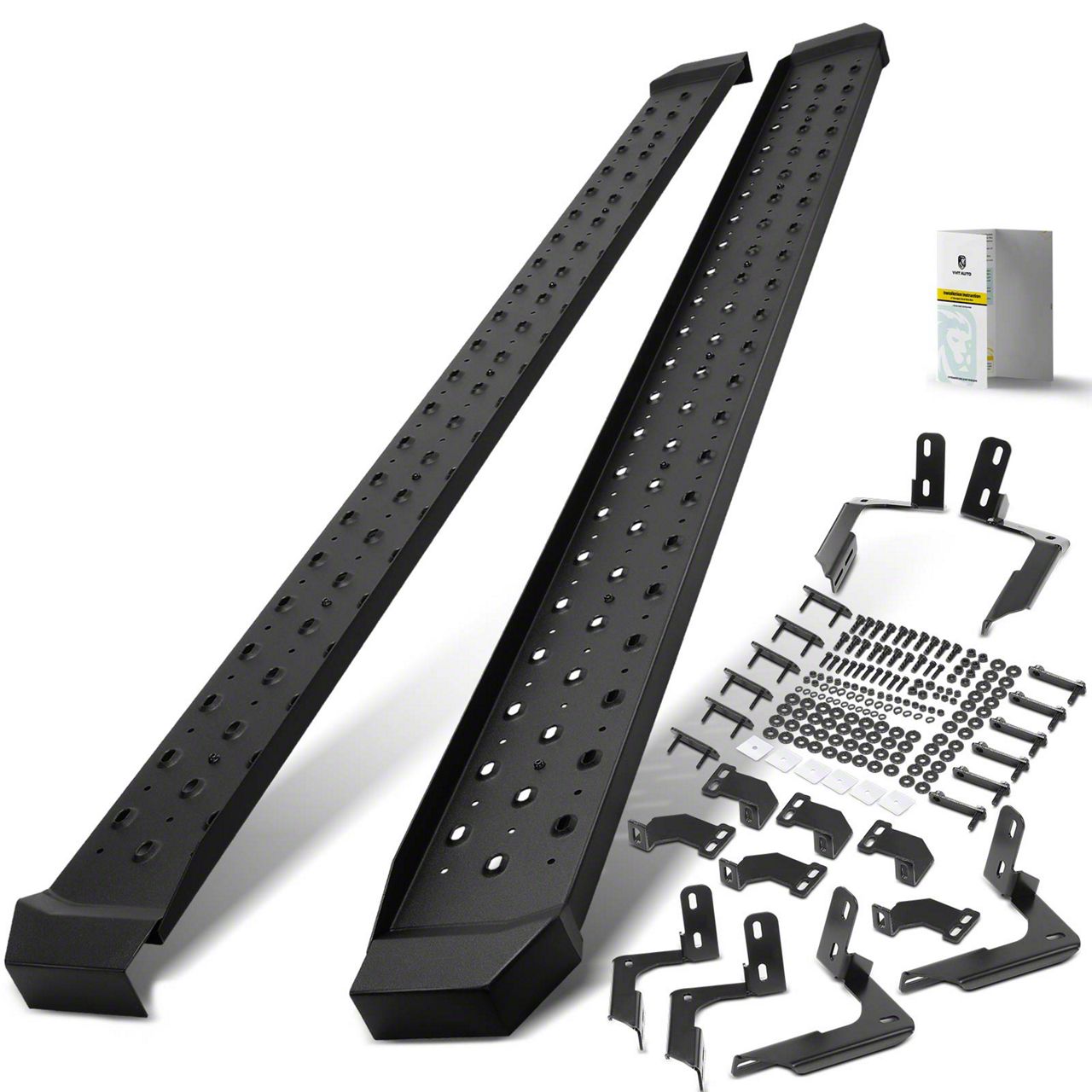 Installation. The Rugged 6.50-Inch Rattler Running Boards are designed for a straightforward installation procedure with no drilling or modification required. They come complete with all necessary mounting hardware, making the installation process quick and hassle-free.