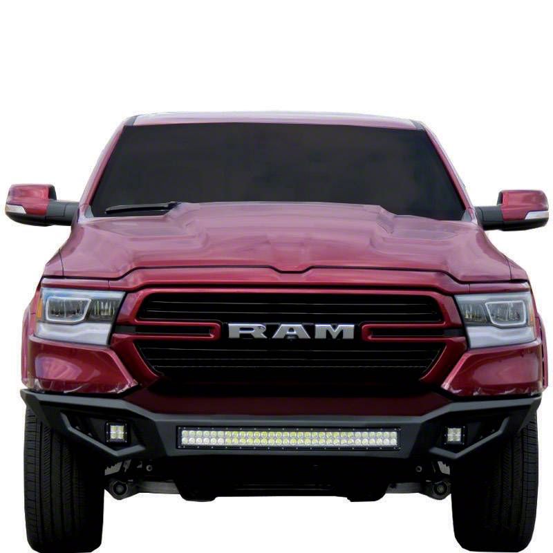 Upgraded Style and Protection. Get rid of your RAM’s flimsy factory bumper and replace it with this Armour Front Bumper with LED Lights; Black. This front bumper upgrades your RAM’s style and protection by a mile with its ultra-rigid structure and sleek good looks. It features auxiliary lights for added style and functionality.