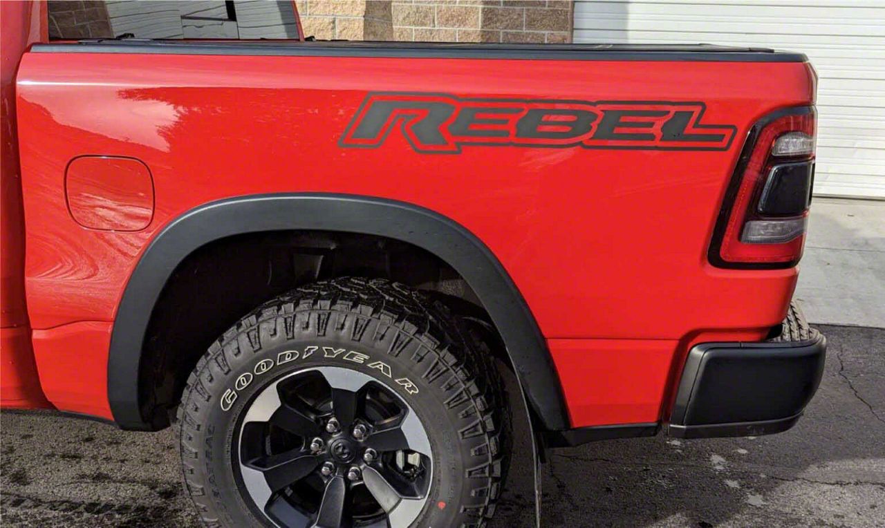 Matte Black Appeal. Give your truck a distinctive look with the Bed Graphics with Rebel Logo, specifically tailored for all 2019-2026 Dodge RAM 1500 Rebel models. These graphics are made from hard-wearing vinyl material, ensuring durability and long-lasting appeal. The matte black finish offers a sleek, stylish touch that complements any truck color.