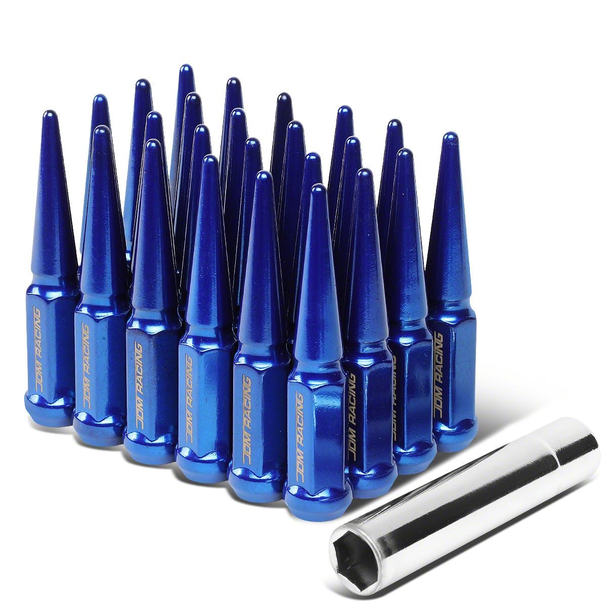 Durable Steel Construction. Built from premium-quality steel, these Blue Steel Spiked Lug Nuts; M14x1.5; Set of 24 provide long-lasting strength and reliability. The spiked design is precision-machined to resist wear and damage, while the durable finish protects against corrosion and fading, even in tough driving conditions.