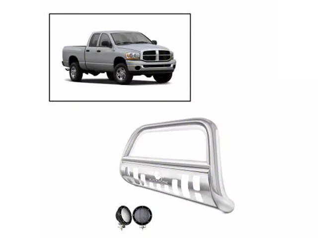 Application. The Bull Bar with 5.30-Inch Black Round Flood LED Lights; Stainless Steel fits 2002-2008 RAM 1500 models.