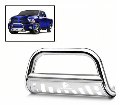 Aggressive Styling. Enhance the front-end style and protection of your RAM 1500 with the Bull Bar with Stainless Steel Skid Plate; Stainless Steel. It mounts securely to the front of your truck, providing a seamless integration with the existing frame and grille. The bull bar's rugged appearance enhances the overall aesthetics of your ride, giving it a more commanding presence on and off the road.