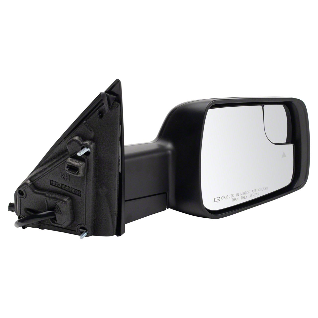 Powered and Heated Composition. This direct-fit replacement Checkered Flag Style Powered Heated Mirror for the passenger side features a Black finished housing, seamlessly blending with your Dodge RAM 1500's design. Furthermore, the powered and heating functions provide enhanced visibility and convenience, ensuring optimal performance and safety during those colder months or when dealing with foggy conditions.