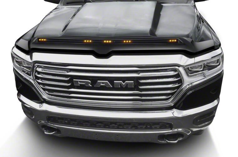 Style and Protection. Elevate the protection and style of your RAM 1500 with the Aeroskin LightShield Color-Match Hood Protector; Brilliant Black Crystal. This innovative hood protector not only shields the front edge of your hood from road debris and impacts but also integrates advanced LED lighting to enhance your visibility and safety on the road.
