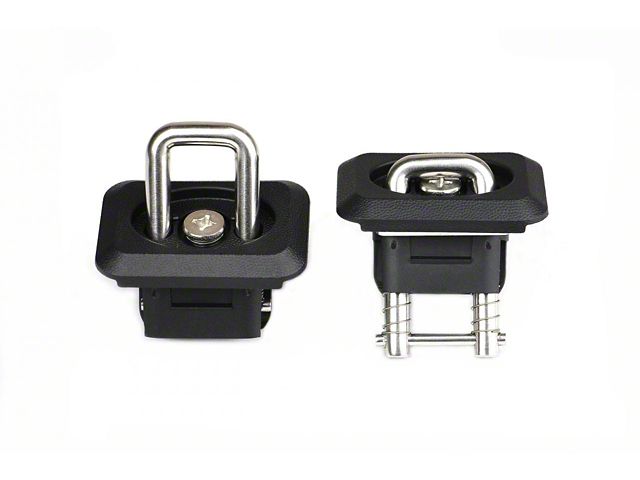 Construction and Appearance. Crafted from durable stainless steel with a nylon lower body for sound dampening, these tie-down anchors are built to last. The retractable anchor ring lifts at a 35-degree angle, optimizing the securing process with ratchets and rope while maintaining a sleek, functional design.