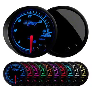 This 2 1/16" (52mm) 30 PSI fuel pressure gauge boasts incredible features that include programmable high and low warning functions, a peak recall function, stepper motor technology, 10 color through dial LED lighting, as well as a self-calibration mode at startup, an illuminated red needle, and a low profile magnified tinted lens. The adjustable high and low warning functions will alert you visually or with an optional audible tone, ensuring your vehicle’s fuel pressure is not running too low, and the peak recall ability gives you an instant feedback. The included stepper motor allows for all needle movement to be incredibly smooth and all gauge readings to be exceptionally accurate. GlowShift’s 10 color through dial lighting lets you match your factory gauges or add a custom look to the interior of your vehicle, and with the color recall feature, you don’t have to worry about resetting the gauge to your preferred color every time you turn your vehicle on. This fuel pressure gauge also dims 30% when connected to your factory headlight switch, making it much easier to read while driving at night.
