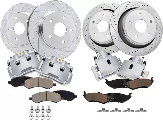 Superior Braking. A front and rear model, this kit uses 5-lugs and includes drilled and slotted rotors and ceramic compound brake pads for superior stopping power.
