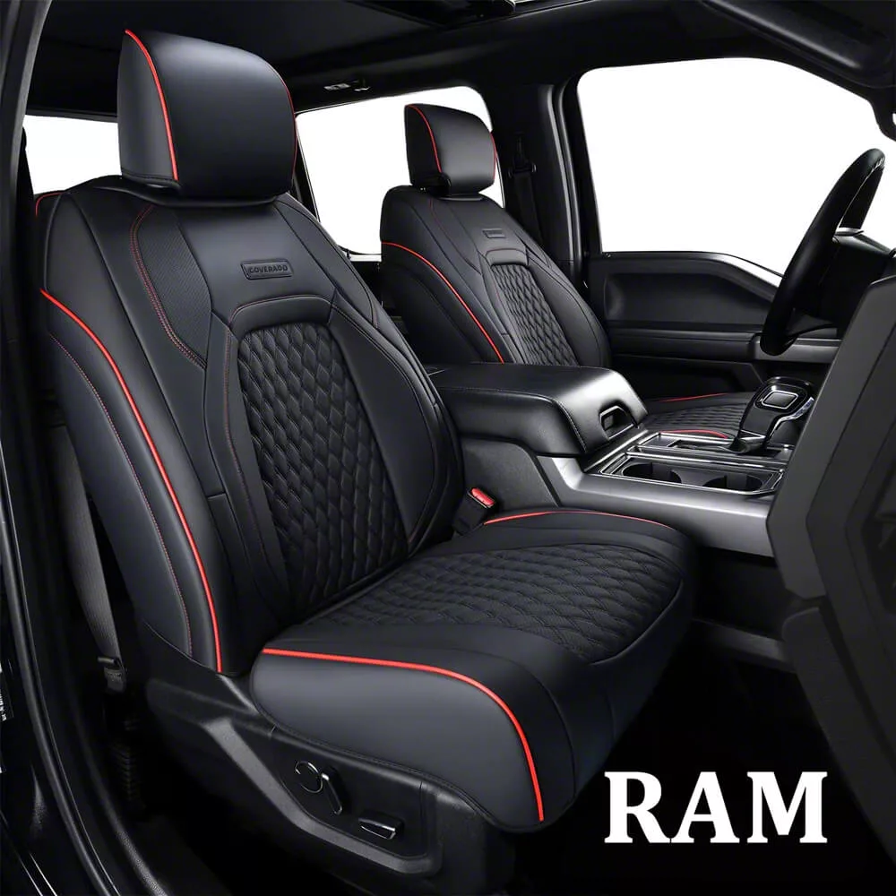 Elevating Your Ride's Ambiance. Step into a realm of refined automotive aesthetics with our Faux Leather Custom Front Seat Covers. These meticulously crafted covers transcend mere functionality, serving as a transformative element that significantly enhances your 2019-2018 Dodge RAM 1500's interior style. The sleek black base provides a canvas of understated sophistication, while the striking red piping accents inject a vibrant touch of personalized flair.