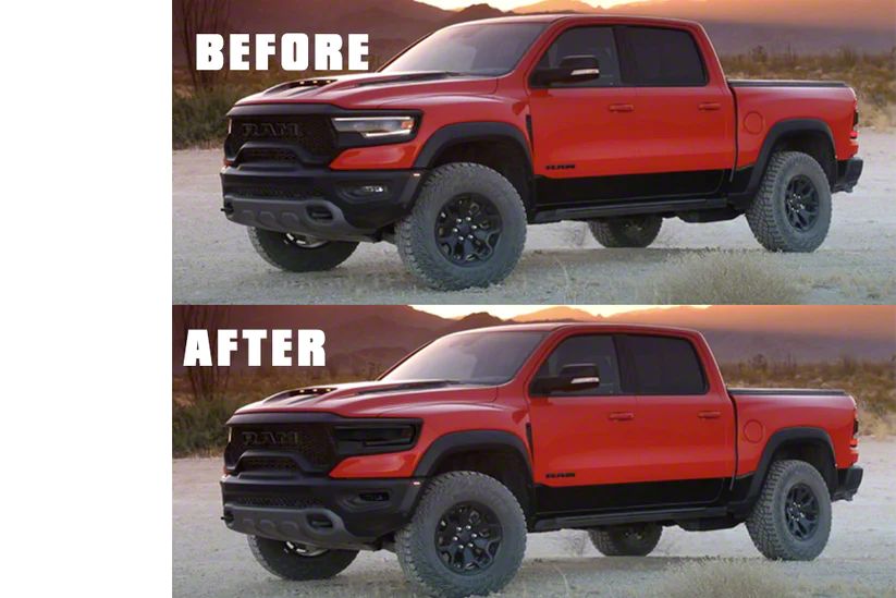 Sleek Dark Look. Elevate the look of your RAM 1500 TRX with the Front and Rear Lens Vinyl Tint Kit. Tailored with a custom-fit design, this kit is a perfect match for your vehicle, providing a sleek and sophisticated aesthetic upgrade without compromising the original design. Crafted from high-grade, durable vinyl material, the kit stands up against the elements.