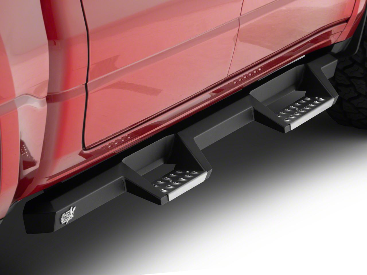Excellent Durability. Manufactured from high-strength steel, these HDX Drop Nerf Side Step Bars are built to handle tough jobs. The hoop steps feature wear-resistant, die-stamped stainless steel plates with punched and raised holes to provide secure footings on wet and dry conditions. Additionally, these steel frameworks are covered in a textured black powder-coated finish for extra resistance against corrosion and other harsh outdoor elements.