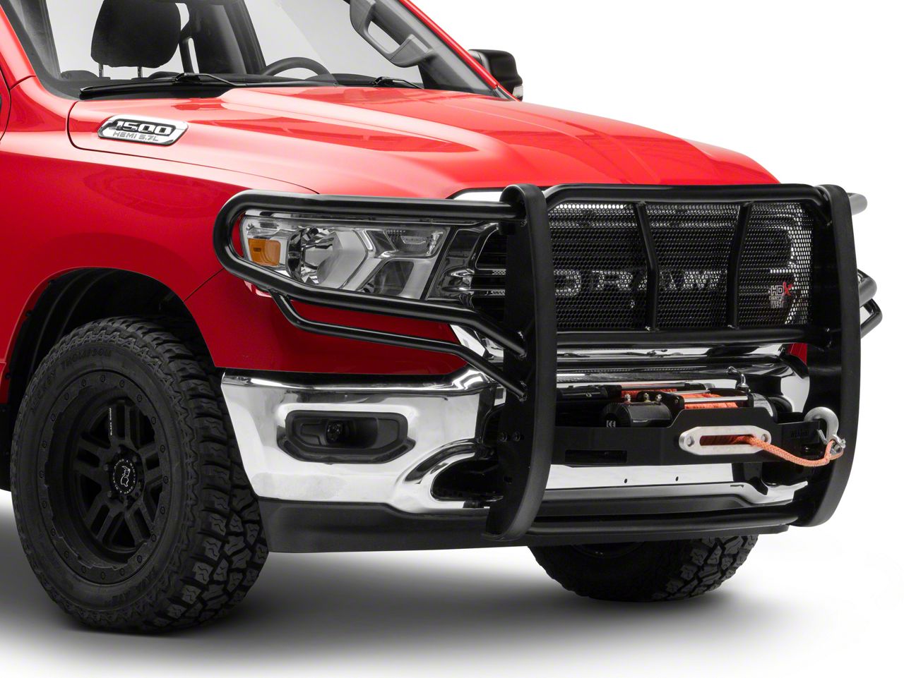 Leveled-Up Function and Protection. The HDX Black Winch Mount Grille Guard is the grille guard for your RAM 1500 that offers added protection and functionality for the open trail. Specifically, this assembly comes with everything you expect from a grille guard, including wraparound side wings and a punch hole plate panel on its central frame. What makes this grille guard different is a 12,000-pound winch tray located beneath the grille section, which allows you to perform emergency recovery winching. This feature makes this guard a smart alternative to winch-ready off-road bumpers which can be more complicated to install.