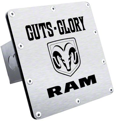 Intricately Designed. Introducing the Guts, Glory, RAM Class III Hitch Cover. This beautifully crafted hitch cover is made from pure stainless steel and features an intricately designed Guts, Glory, RAM logo. It's proudly made in the USA and is a perfect way to show your patriotism and love for your country. Whether you're towing a trailer or just want to show off your love for the RAM brand, this hitch cover is a great way to do it.