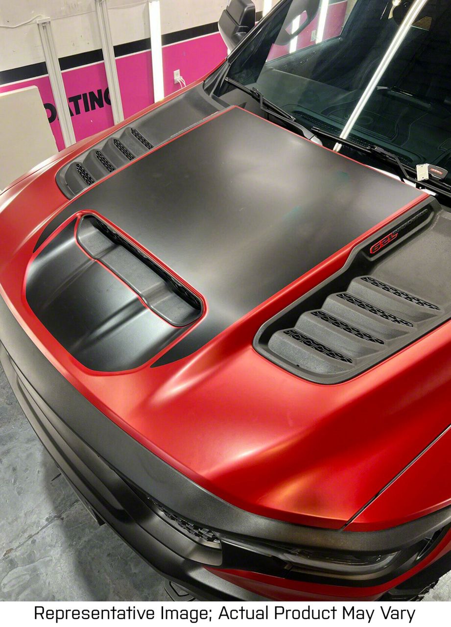 Carbon Fiber Black Look. Elevate the appearance of your 2021-2025 RAM 1500 TRX with this striking Hood Graphic. This decal is backed by a 1-year warranty, ensuring quality and durability. The graphic boasts a sophisticated carbon fiber black finish, adding a sleek and modern touch to your vehicle. Made from durable HC vinyl material, it's designed to withstand various environmental conditions while maintaining its appearance.