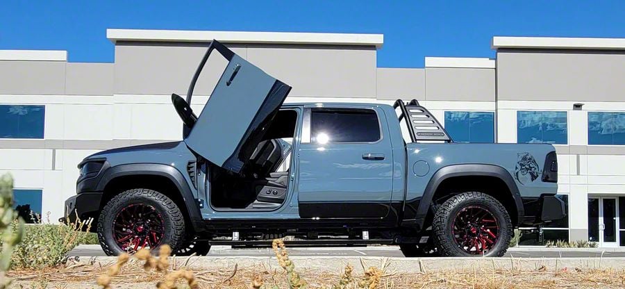 Eye-Catching Modification. Transform your RAM 1500 with this Lambo Door Kit, an eye-catching modification that adds an exotic touch to your vehicle. As a direct bolt-on kit, it offers a straightforward installation process, attaching directly to the original stock hinge bolt pattern without requiring extensive modifications.