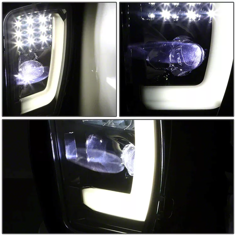 Construction and Appearance. The LED Projector Fog Lights feature durable black housing with driver and passenger side bezel covers. The lenses are made from impact-resistant clear polycarbonate, ensuring durability and clarity.