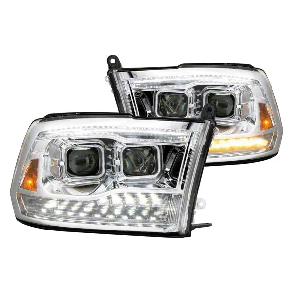 Futuristic Design. Step into the future with a pair of Light Bar Style Projector Headlights; Chrome Housing; Clear Lens. The headlight's solid Light Bar style and projector light give your RAM 1500 a menacing look. These projector lights will immediately improve the look and are an easy drop-in replacement for the bland factory headlights. Once you install these lights, people will think you are driving the newest RAM 1500 on the market.