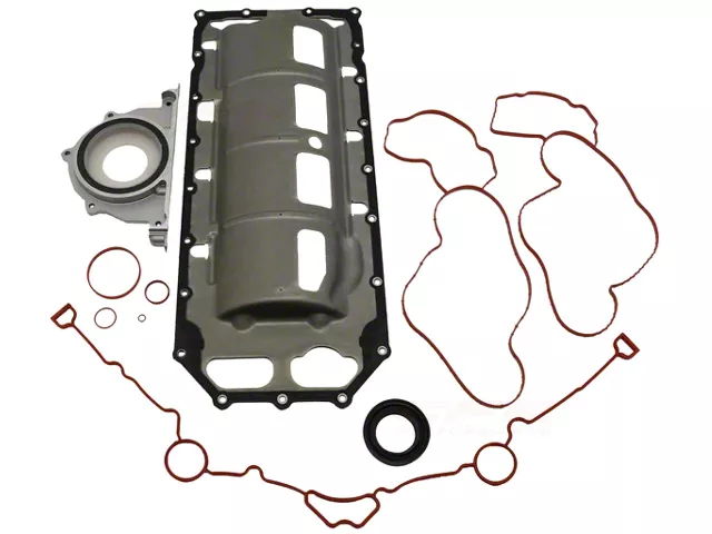Engine Preservation. The Lower Gasket Conversion Kit is an essential upgrade for maintaining the integrity of your engine. Designed for 2003-2024 5.7L Dodge RAM 1500 models, this complete kit includes an oil pan, rear main seal, water pump, and a timing cover, ensuring your engine is sealed and protected against leaks and other common issues. The matte black and raw metal finish of the components not only provides durability but also enhances the engine's appearance.