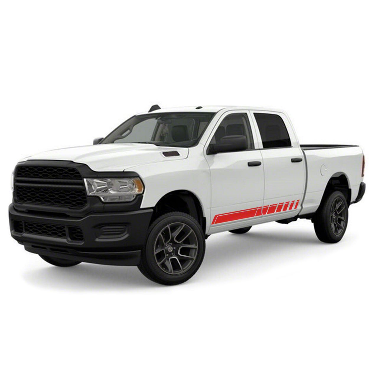 Bold and Modern Styling. The Lower Rocker Panel Stripes in Red offer a striking visual enhancement for your vehicle. These decals, designed for both the driver and passenger sides, feature a bold, striped design that runs the length of the cab, providing a modern and stylish look for your RAM 1500.