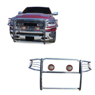 Construction and Appearance. Crafted from 304 stainless steel, this grille guard is not only sturdy and resistant to rust and corrosion but also adds a stylish, aggressive edge to your RAM 1500. The addition of LED flood lights further enhances its functionality, making it a perfect blend of form and function for off-road enthusiasts and those looking to augment their vehicle's appearance.