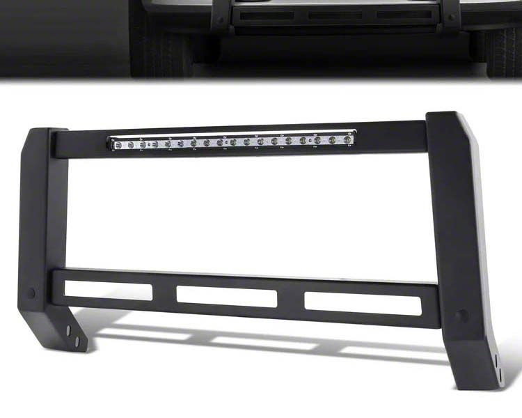 Construction and Features. Crafted from high-quality carbon steel, this bull bar is finished in a textured black coating, offering superior durability and resistance against the elements. The integrated LED light bar provides additional lighting for off-road or low-visibility conditions, while the included license plate mounting bracket ensures compliance with vehicle regulations. The modular design allows for easy customization and a sleek appearance.